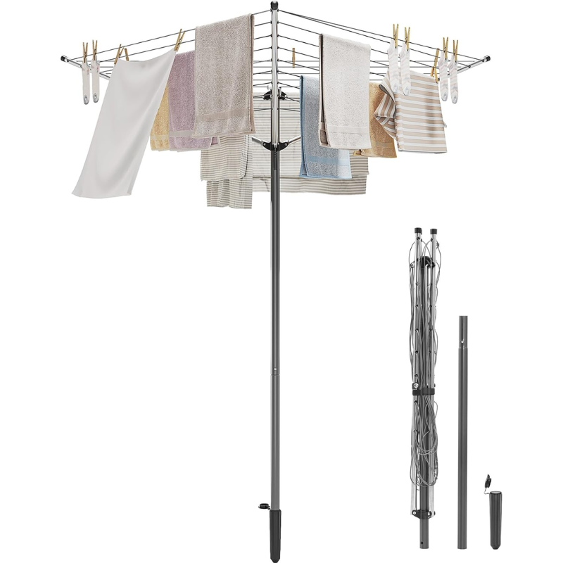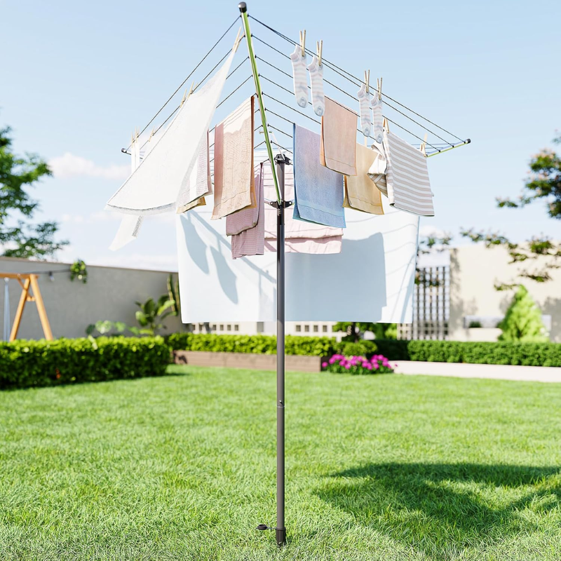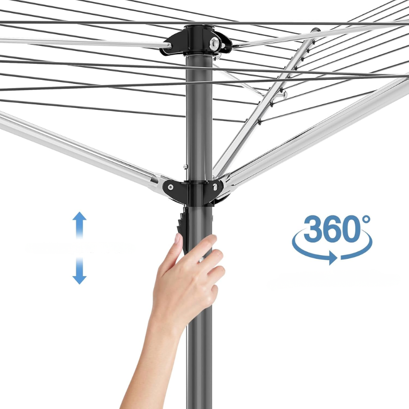 Praktyczna suszarka ogrodowa w formie parasola to wygodne rozwiązanie do codziennego suszenia prania na świeżym powietrzu. Duża powierzchnia suszenia pozwala jednocześnie rozwiesić nawet kilka wsadów pralki, oszczędzając czas i miejsce. Stabilna konstrukcja oraz możliwość regulacji wysokości sprawiają, że suszarka dobrze radzi sobie także z cięższymi tekstyliami. Obrotowa głowica umożliwia równomierne suszenie bez konieczności przemieszczania prania. Składana forma ułatwia przechowywanie, gdy produkt nie jest używany.