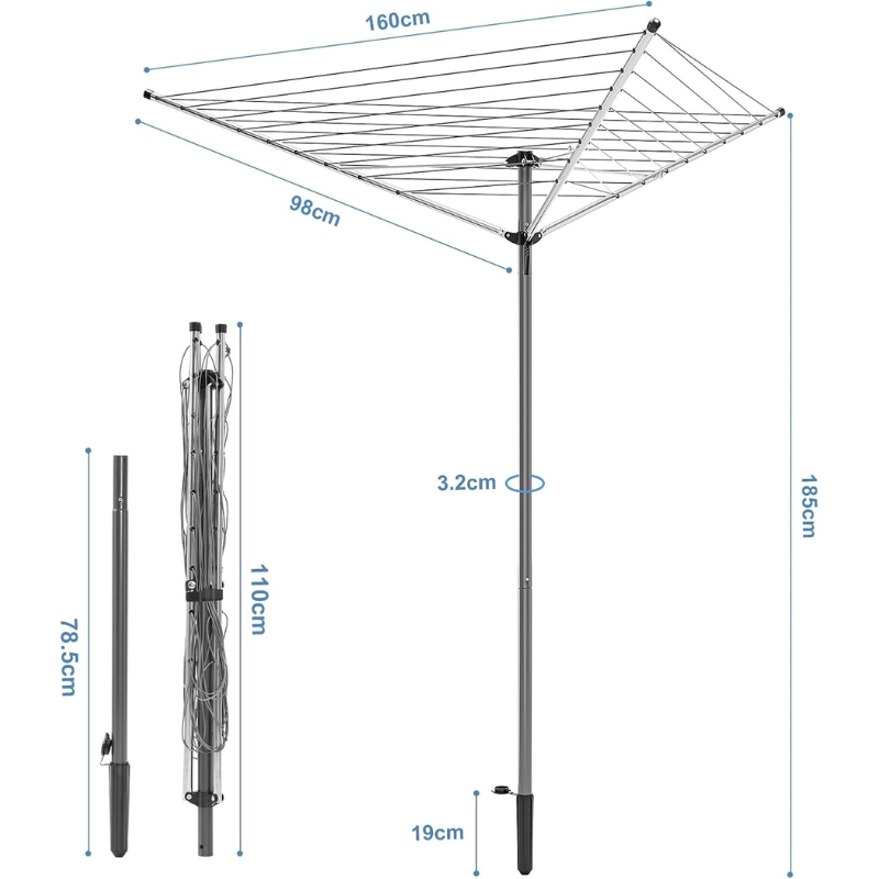 Produkt przeznaczony do użytku zewnętrznego. Zaleca się stabilne osadzenie tulei w gruncie przed pierwszym użyciem. Po złożeniu suszarkę należy zabezpieczyć paskiem, aby zapobiec samoczynnemu rozłożeniu. Kolory mogą nieznacznie różnić się w zależności od ustawień monitora. Podane wymiary mogą różnić się o kilka milimetrów w zależności od sposobu pomiaru.