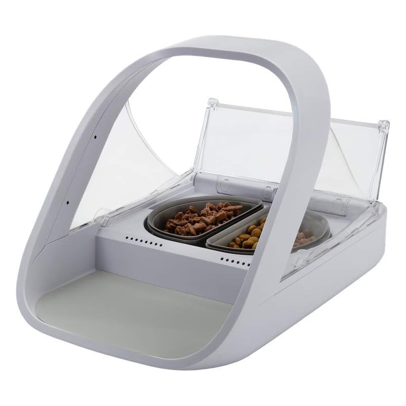 - Dwie komory z miskami 400 g – można podzielić karmę suchą i mokrą.