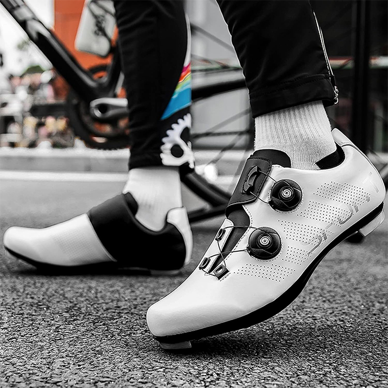 Profesjonalne buty rowerowe SPD w kolorze biało-czarnym, stworzone z myślą o pasjonatach kolarstwa szosowego i MTB. Dzięki zastosowaniu nowoczesnych rozwiązań technologicznych i lekkiej konstrukcji zapewniają doskonałą efektywność pedałowania, komfort oraz stabilność w trakcie jazdy.
