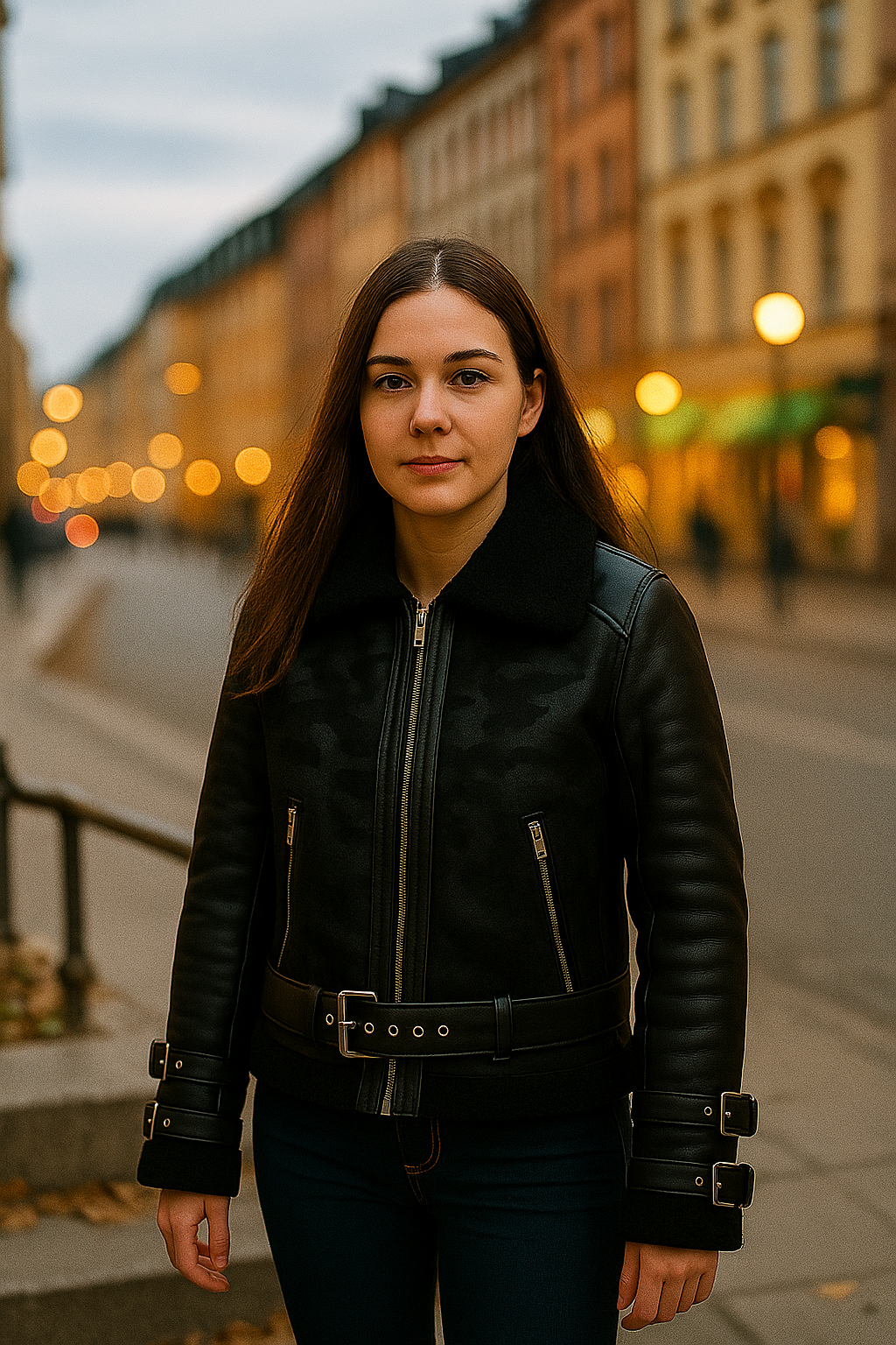 Model wyróżnia się asymetrycznym zamkiem, dekoracyjnymi pasami na rękawach oraz szerokim kołnierzem, który dodaje sylwetce wyrazistości. To kurtka idealna zarówno do stylizacji casualowych, jak i bardziej wyrazistych outfitów.