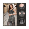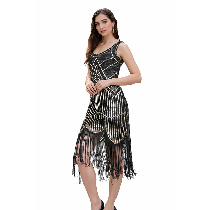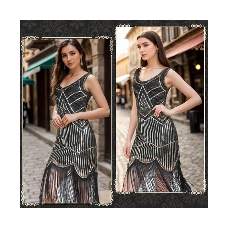 Elegancka sukienka inspirowana modą lat 20. w stylu Great Gatsby to idealny wybór na wyjątkowe okazje i imprezy tematyczne. Klasyczny fason prosty połączony z dekoracyjnymi cekinami i frędzlami tworzy efektowną, wieczorową stylizację. Dekolt w serek subtelnie podkreśla sylwetkę, a długość do połowy łydki nadaje całości elegancji. Model bez rękawów zapewnia komfort noszenia oraz swobodę ruchów. Sukienka sprzedawana jest w komplecie z pasującymi dodatkami, tworząc spójny zestaw.