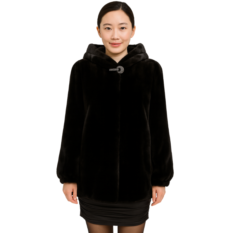 Model posiada praktyczny kaptur, który chroni przed wiatrem i zimnem. Zapięcie na haftki jest dyskretne, dzięki czemu futerko prezentuje się stylowo i minimalistycznie. W talii znajduje się delikatny ściągacz podkreślający sylwetkę, a dwie kieszenie z przodu zwiększają wygodę noszenia.