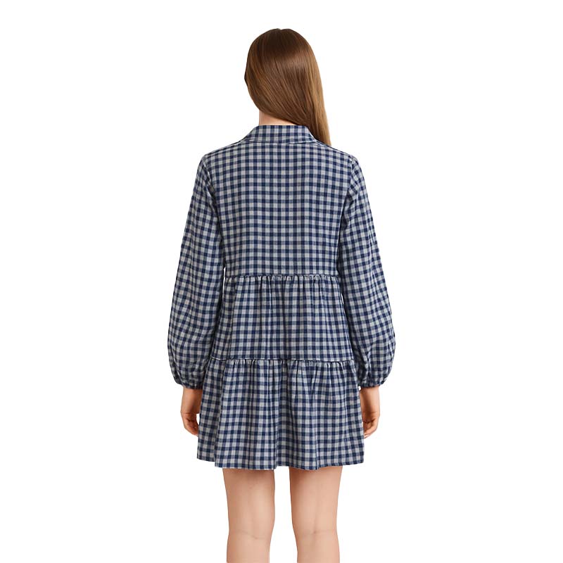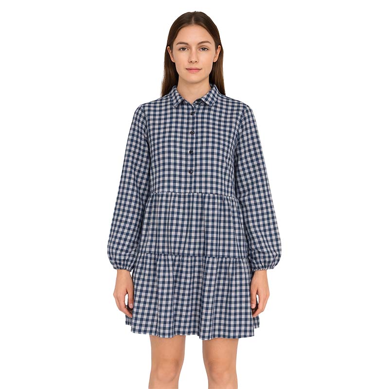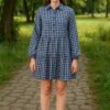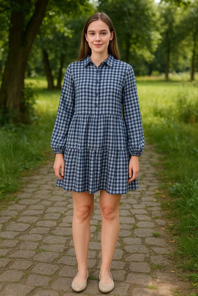 Lekka, wygodna i stylowa sukienka na co dzień, wykonana z połączenia bawełny i poliestru. Krój rozkloszowany z odcięciem w talii nadaje sylwetce lekkości i swobody, a wzór w kratkę podkreśla casualowy, miejski charakter. Dzięki długim rękawom zakończonym elastyczną gumką oraz kołnierzykowi całość zyskuje elegancki akcent, jednocześnie pozostając praktyczną w codziennym noszeniu.
