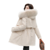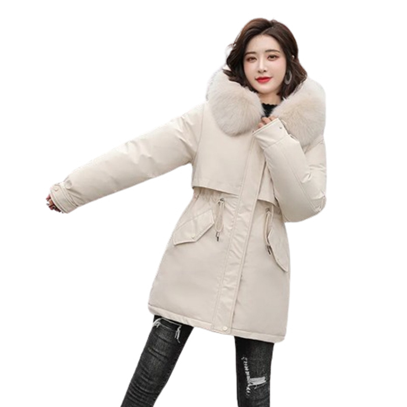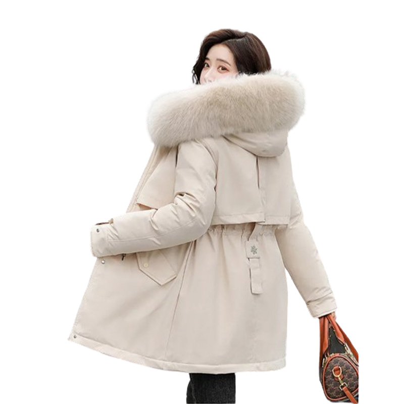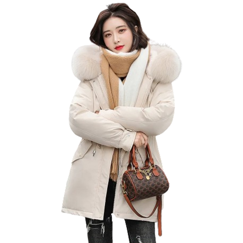 Damska parka beżowa z futrzanym kapturem, rozmiar XL