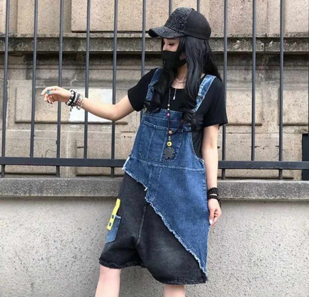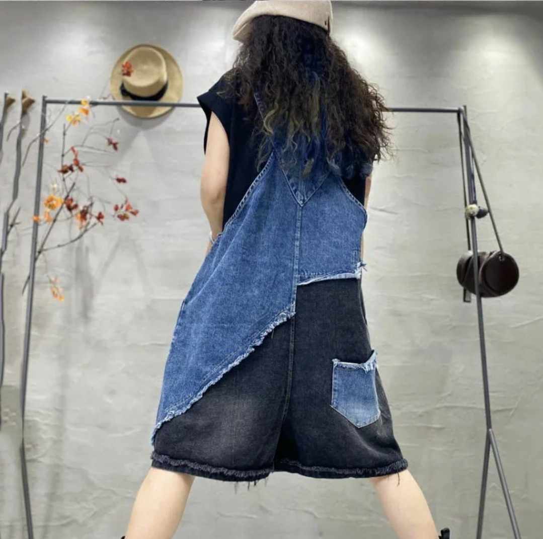 Damski kombinezon jeans oversize – krótkie spodnie z szelkami