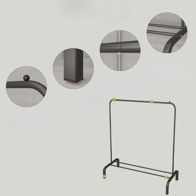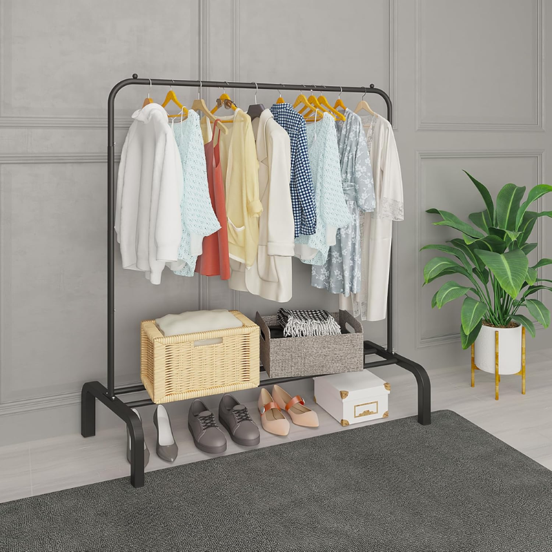 Funkcjonalny i solidny stojak na ubrania JIUYOTREE to praktyczne rozwiązanie do codziennego przechowywania odzieży w domu, garderobie lub przestrzeni komercyjnej. Metalowa konstrukcja zapewnia wysoką stabilność oraz dużą nośność, umożliwiając jednoczesne wieszanie wielu elementów garderoby. Minimalistyczna forma w czarnym, matowym wykończeniu sprawia, że stojak dobrze komponuje się z nowoczesnymi i klasycznymi wnętrzami. Dolna półka zwiększa przestrzeń użytkową i pozwala wygodnie przechowywać obuwie lub pudełka. Produkt sprawdzi się zarówno w sypialni, przedpokoju, jak i w butiku czy studiu.