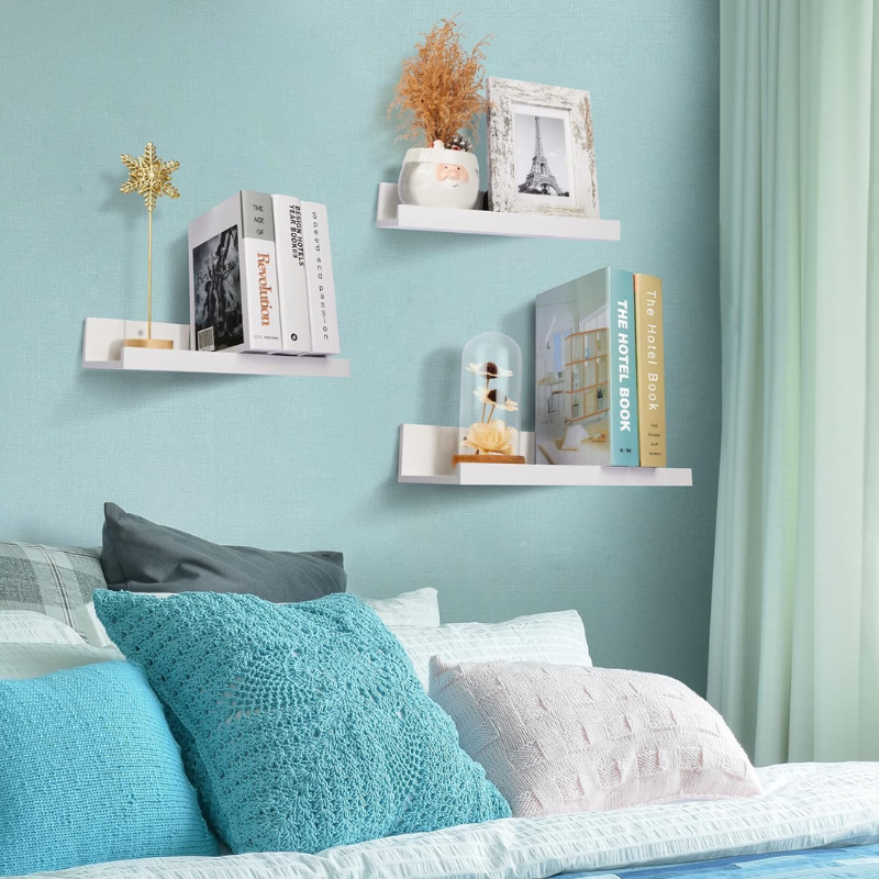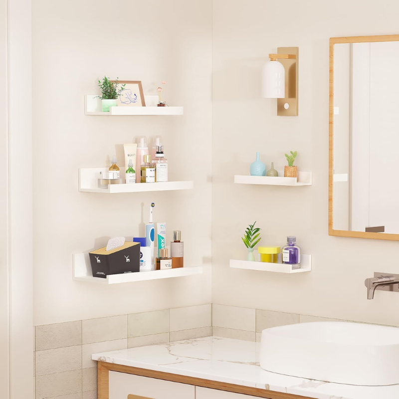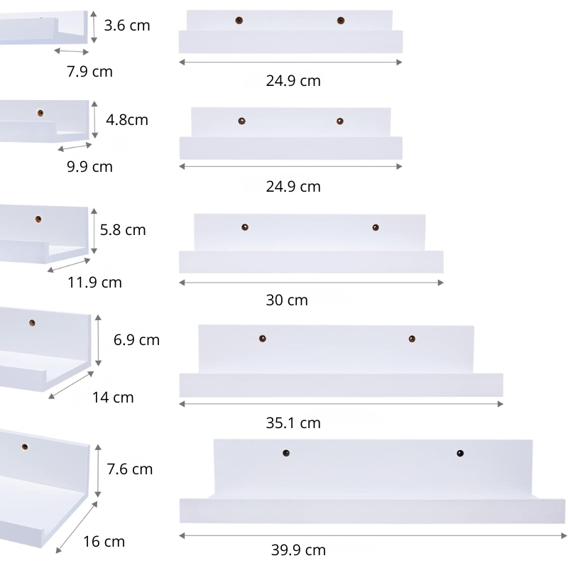 Komplet pięciu białych półek ściennych w różnych rozmiarach to funkcjonalne i estetyczne rozwiązanie do każdego wnętrza. Pozwalają efektywnie wykorzystać przestrzeń na ścianach, jednocześnie porządkując i eksponując dekoracje, ramki ze zdjęciami, rośliny czy drobne akcesoria. Klasyczny biały kolor oraz minimalistyczna forma sprawiają, że półki pasują zarówno do nowoczesnych, jak i bardziej tradycyjnych aranżacji. Przedni rant zabezpiecza przed zsuwaniem się przedmiotów. Zestaw sprawdzi się w salonie, sypialni, kuchni, łazience, biurze lub pokoju dziecięcym.