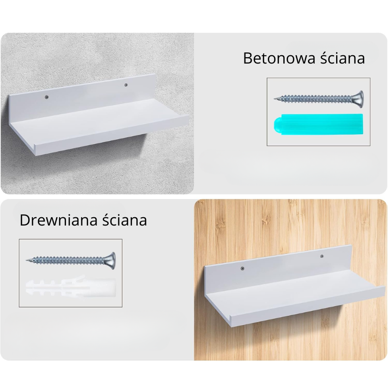 Półki wykonane są z płyty MDF o gładkim, matowym wykończeniu, co zapewnia estetyczny wygląd i łatwe utrzymanie w czystości. Solidna konstrukcja umożliwia bezpieczne użytkowanie przy codziennym obciążeniu. Dzięki fabrycznie przygotowanym otworom montażowym instalacja jest szybka i intuicyjna, nawet dla osób bez doświadczenia.