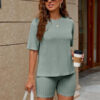 Stylowy damski komplet dresowy składający się z koszulki z krótkim rękawem oraz dopasowanych spodenek. Wykonany z elastycznego, przyjemnego w dotyku materiału, który dobrze układa się na sylwetce i zapewnia komfort noszenia przez cały dzień.