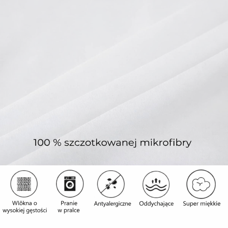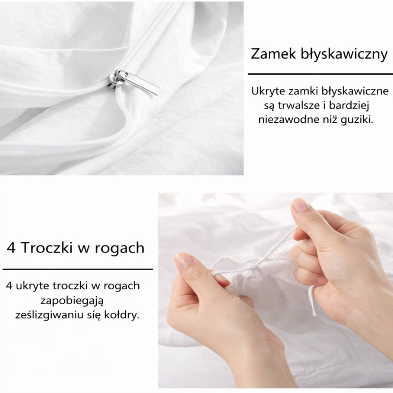 Zestaw pościeli obejmuje 1 poszewkę na kołdrę oraz 2 poszewki na poduszki. Nowoczesny geometryczny nadruk z efektem marmuru jest dwustronny i pozwala łatwo odmienić wygląd sypialni. Ukryty zamek błyskawiczny ułatwia zakładanie i zdejmowanie pościeli, a troczki w narożnikach pomagają utrzymać kołdrę na miejscu. Mikrofibra jest materiałem antyalergicznym, trwałym i łatwym w czyszczeniu. Pościel można prać w 40 stopniach, nie wybielać i suszyć w suszarce bębnowej. Produkt posiada certyfikat Oeko-Tex 100, co potwierdza jego bezpieczeństwo i przyjazność dla skóry.