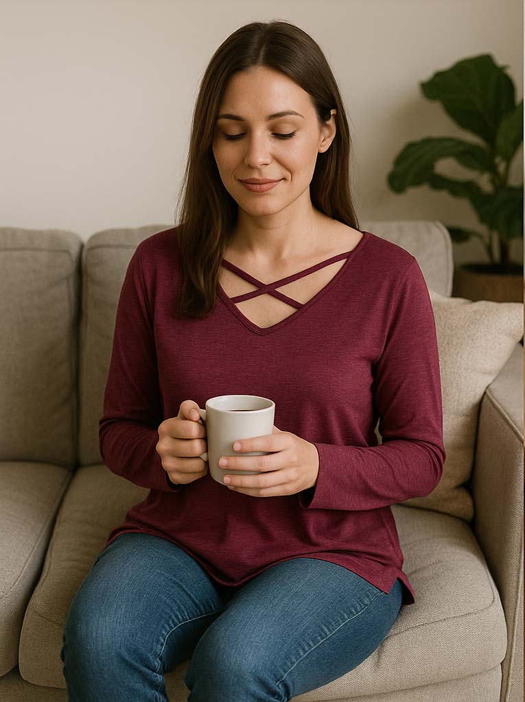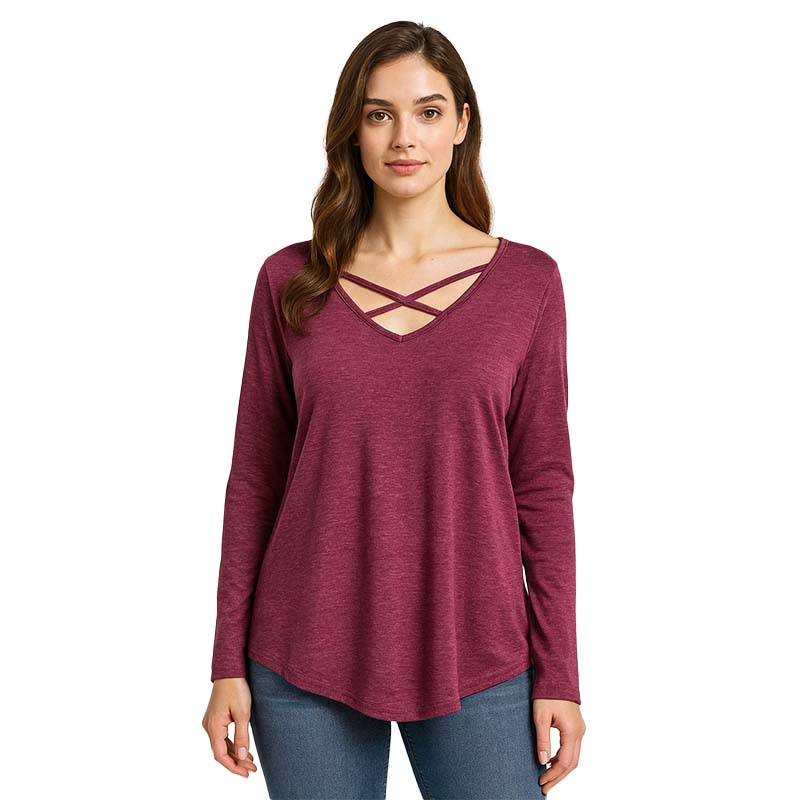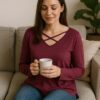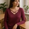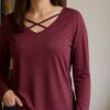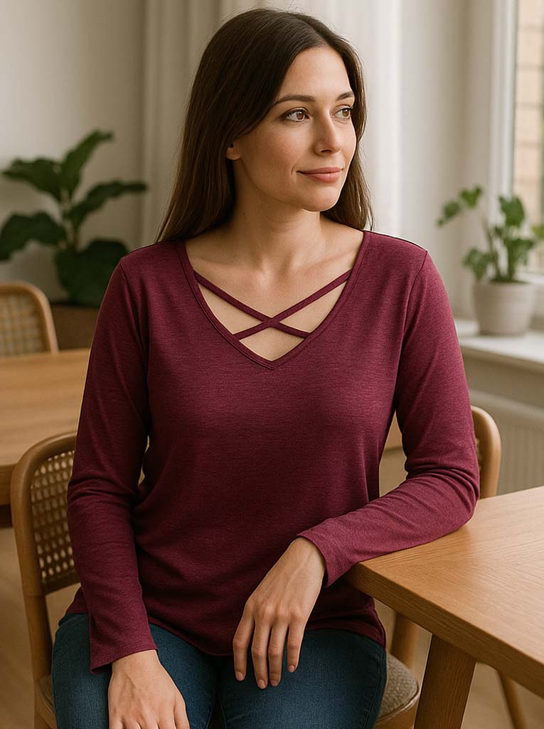Stylowa bluzka damska w kolorze ciemnego różu to doskonała propozycja na co dzień wygodna, a jednocześnie elegancka w swojej prostocie. Dekolt w kształcie litery V subtelnie wysmukla szyję, a dodatkowe krzyżujące się paski nadają całości modnego charakteru.