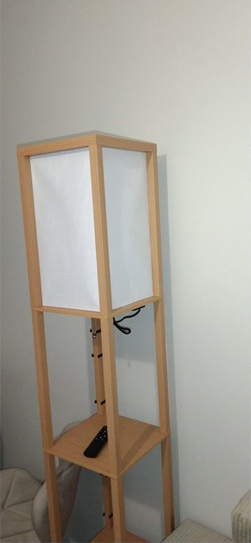Lampa ma wysokość 162 cm oraz szerokość 25 cm. Posiada trzy praktyczne półki, na których można ustawić książki, dekoracje, kwiaty doniczkowe lub inne drobne przedmioty. Dzięki temu lampa pełni nie tylko funkcję oświetleniową, ale także dekoracyjną i użytkową. Górny klosz z delikatnego materiału rozprasza światło, tworząc przyjemny klimat w pomieszczeniu