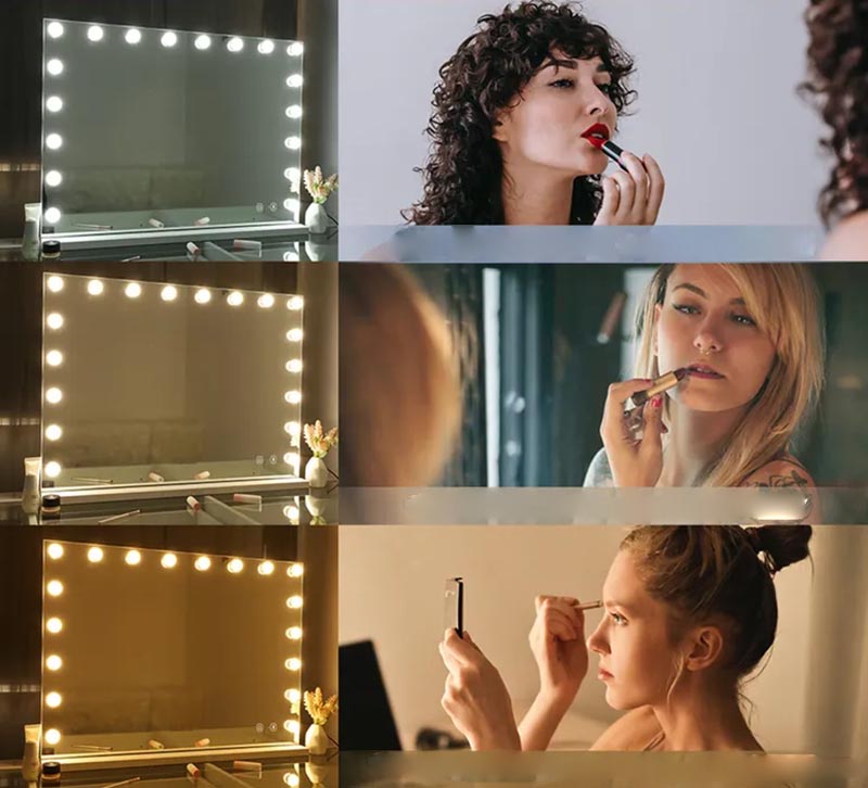 Eleganckie lustro kosmetyczne Hollywood z oświetleniem LED to idealne rozwiązanie do codziennego makijażu, stylizacji oraz pielęgnacji. Duża powierzchnia lustra oraz równomierne oświetlenie zapewniają doskonałą widoczność twarzy i umożliwiają precyzyjne wykonanie makijażu.