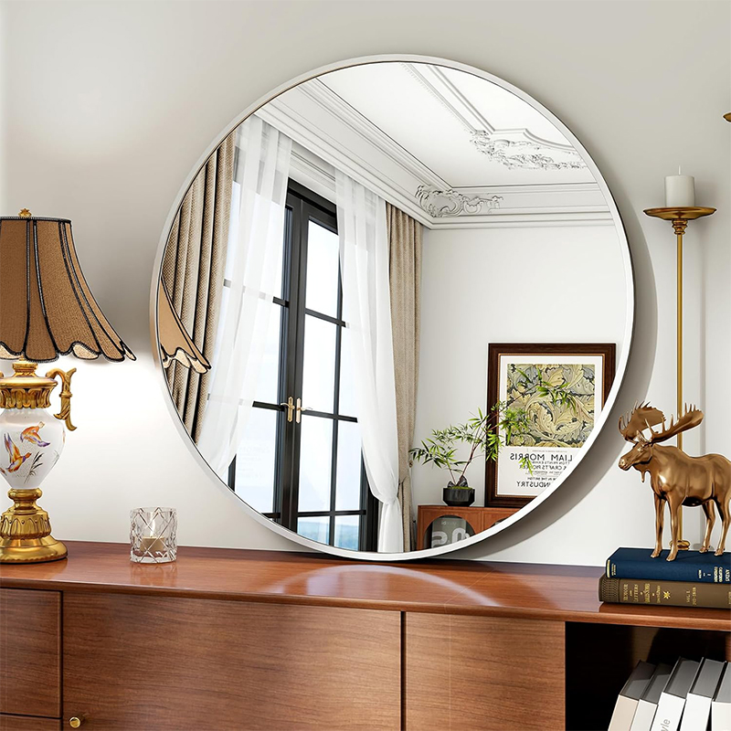 Minimalistyczne lustro okrągłe to elegancki i ponadczasowy element wystroju wnętrza, który doskonale łączy funkcję użytkową z dekoracyjną. Prosta forma oraz subtelna, srebrna rama sprawiają, że lustro harmonijnie wpisuje się w różnorodne aranżacje – od nowoczesnych, przez skandynawskie, aż po klasyczne. Dzięki swojej formie lustro optycznie powiększa przestrzeń i rozjaśnia wnętrze, nadając mu lekkości i estetycznej równowagi. Idealnie sprawdzi się jako centralny element dekoracyjny ściany lub praktyczne lustro codziennego użytku.