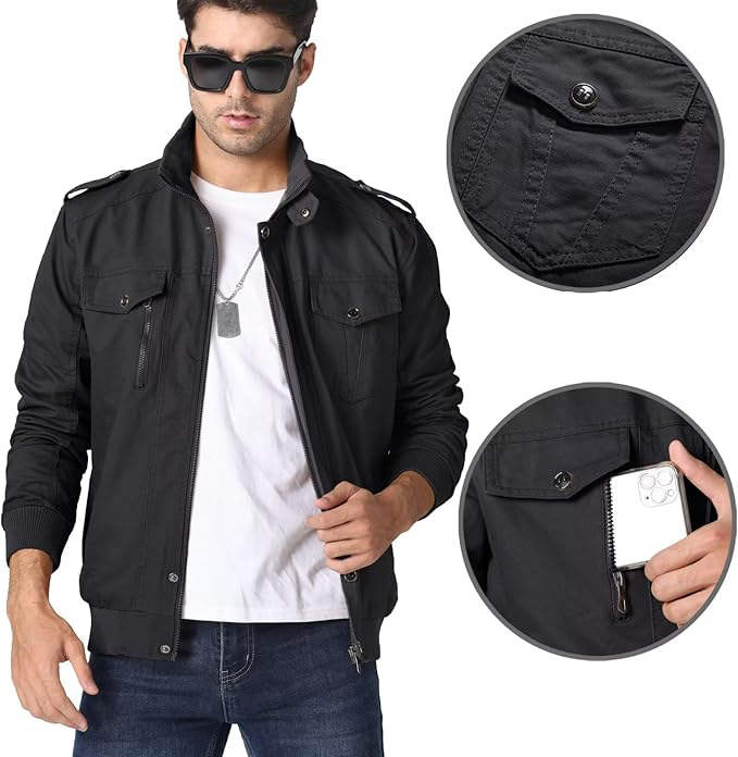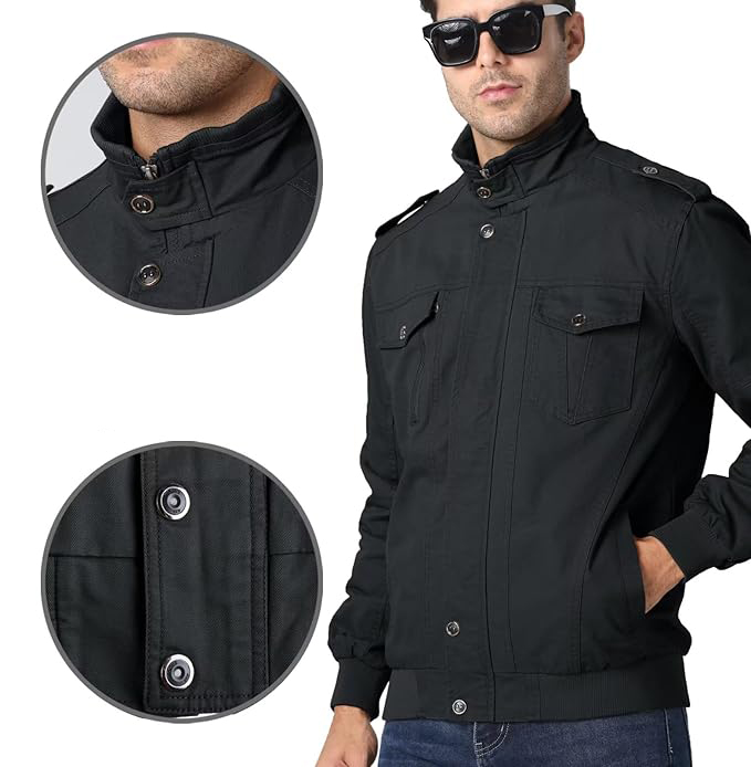 Stylowa i funkcjonalna – klasyczna kurtka w kolorze czarnym, idealna na sezon przejściowy. Jej militarny design i praktyczne kieszenie sprawiają, że świetnie komponuje się z casualowymi i miejskimi stylizacjami.