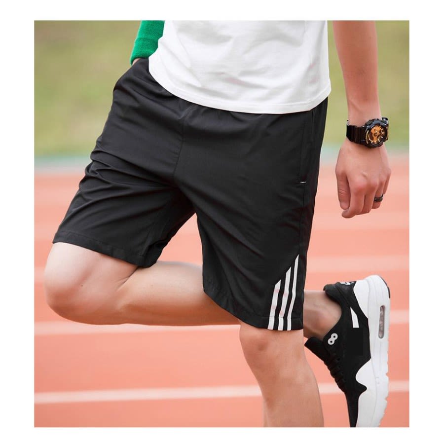 Wygodne, lekkie i elastyczne męskie spodenki sportowe – idealne na trening, bieganie, siłownię oraz codzienne aktywności. Model w klasycznym czarnym kolorze z charakterystycznymi białymi paskami po bokach nadaje stylowego, sportowego wyglądu.