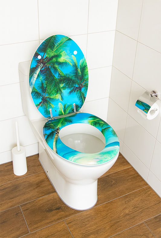 Wprowadź do swojej łazienki odrobinę egzotyki! Ta nowoczesna deska sedesowa z realistycznym nadrukiem palm w intensywnych, tropikalnych kolorach odmieni charakter wnętrza i nada mu unikalny, świeży styl. To idealny wybór dla osób, które cenią oryginalny design i chcą dodać swojej łazience wyjątkowego klimatu.