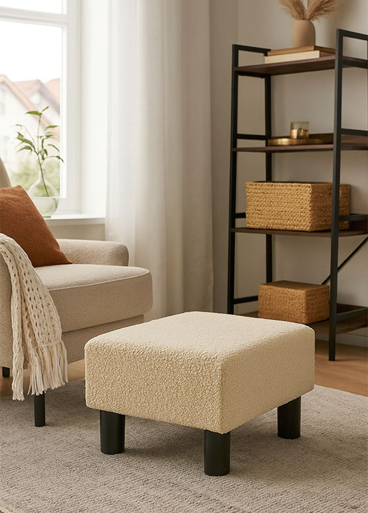 Ta elegancka pufa podnóżek w modnej tkaninie bouclé to wyjątkowy element wyposażenia, który doskonale łączy styl, wygodę i funkcjonalność. Dzięki minimalistycznej formie i subtelnej kolorystyce świetnie wpisuje się w wystrój nowoczesnych, skandynawskich i eleganckich wnętrz, dodając im ciepła i przytulności.