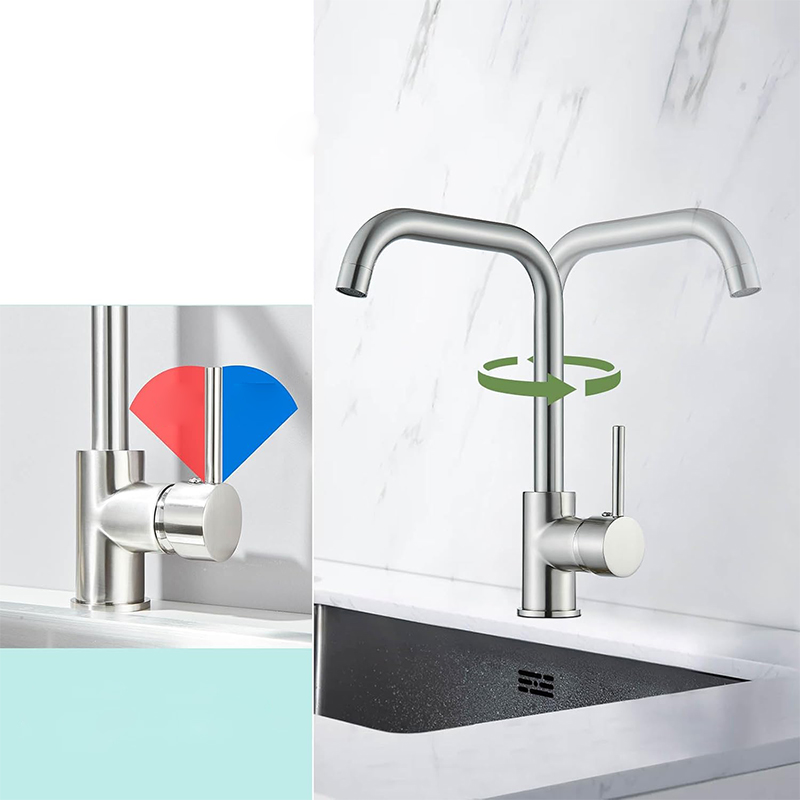 Nowoczesna bateria kuchenna stojąca z wysoką, obrotową wylewką to idealne rozwiązanie do każdej kuchni, łączące funkcjonalność, elegancję i trwałość. Wykonana z wysokiej jakości materiałów, w eleganckim wykończeniu ze stali szczotkowanej, gwarantuje odporność na korozję, łatwość w utrzymaniu czystości oraz wieloletnią niezawodność.
