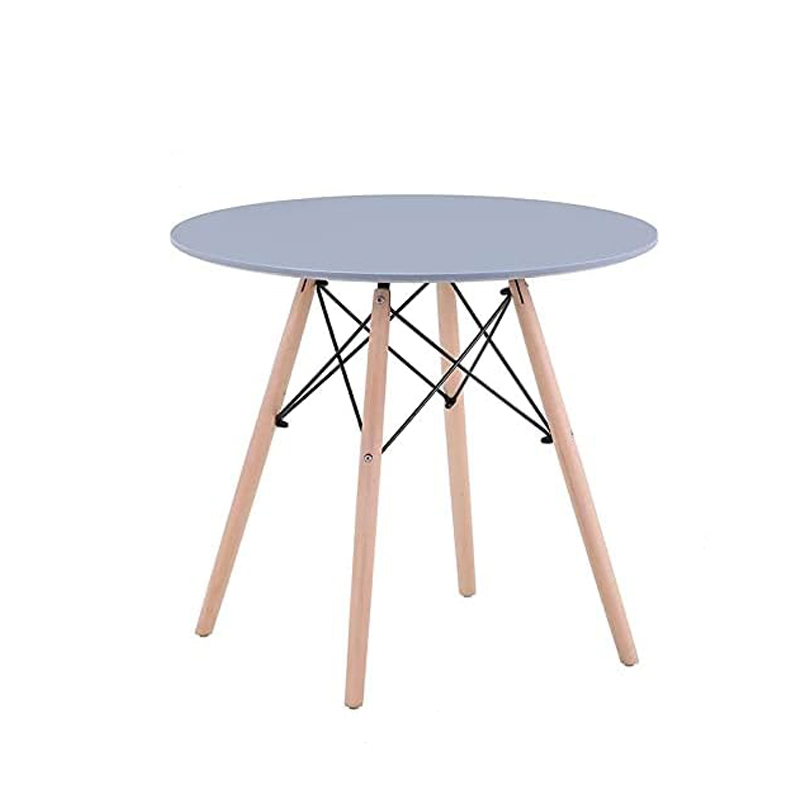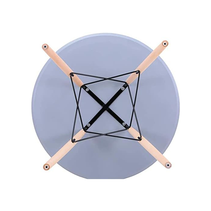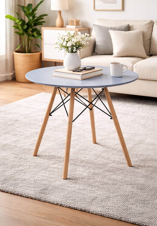 Stabilna konstrukcja: Drewniane nogi zapewniają odpowiednią stabilność oraz trwałość całej konstrukcji. Ich naturalne wykończenie kontrastuje z szarym blatem, tworząc nowoczesny i ponadczasowy efekt wizualny. Okrągły kształt blatu dodatkowo podkreśla lekkość formy i sprawia, że stolik dobrze prezentuje się zarówno w większych, jak i mniejszych pomieszczeniach.