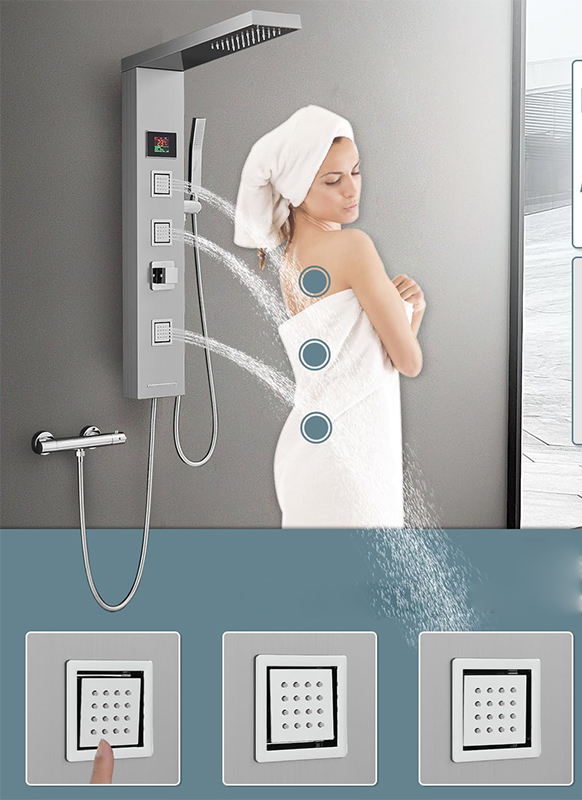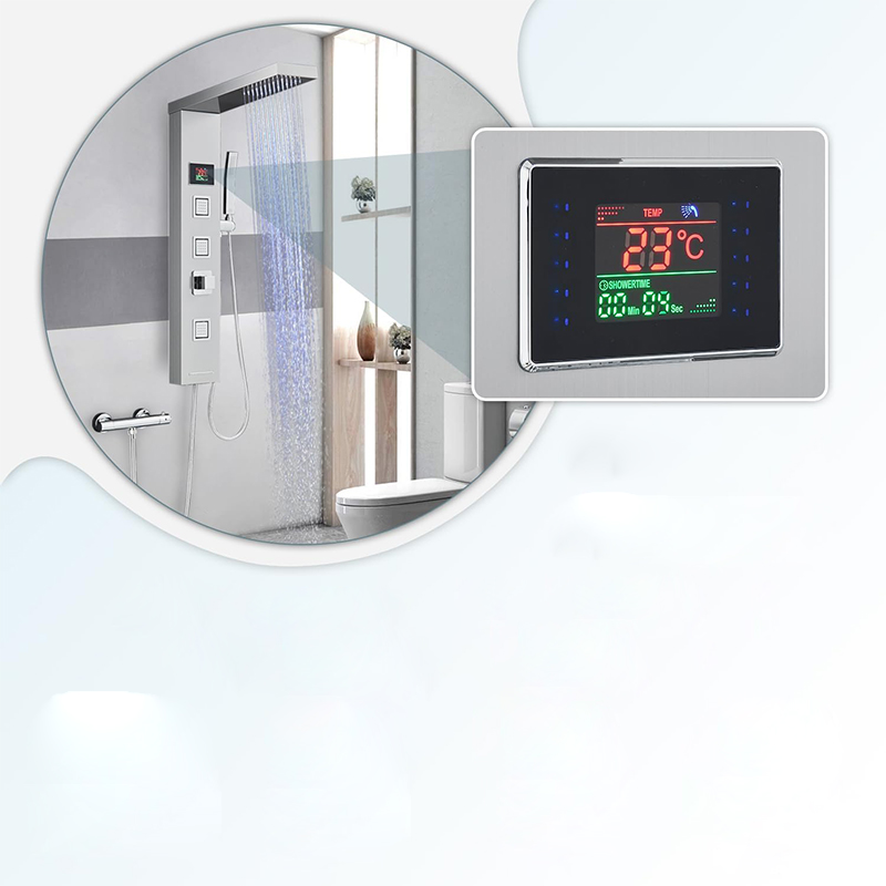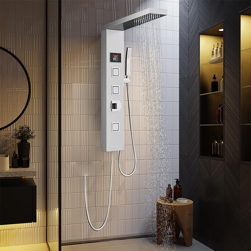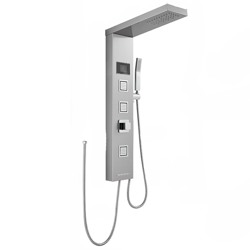 Elegancki i funkcjonalny panel prysznicowy wykonany ze stali nierdzewnej, zaprojektowany z myślą o nowoczesnych łazienkach. Połączenie minimalistycznego designu z zaawansowanymi funkcjami zapewnia komfortowe i bezpieczne korzystanie z prysznica każdego dnia. Panel wyposażony jest w dużą deszczownicę LED oraz czytelny wskaźnik temperatury wody, co pozwala na pełną kontrolę nad kąpielą bez ryzyka nagłych zmian temperatury.