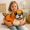 - Zgodność ze zdjęciem: fotografia przedstawia pluszową poduszkę w kształcie foki z rysunkowym nadrukiem w opisanej kolorystyce; rozmiar zgodnie z danymi produktu.