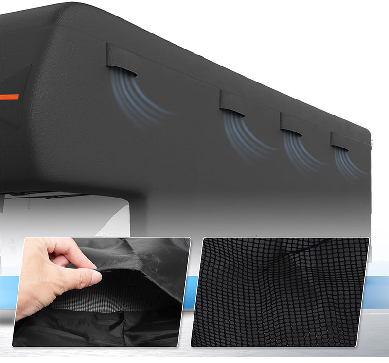 Dzięki zastosowaniu otworów wentylacyjnych pokrowiec umożliwia prawidłowy przepływ powietrza, zapobiegając powstawaniu wilgoci oraz kondensacji pary wodnej wewnątrz. To praktyczne rozwiązanie, które pomaga chronić powierzchnię przyczepy przed pleśnią i korozją.