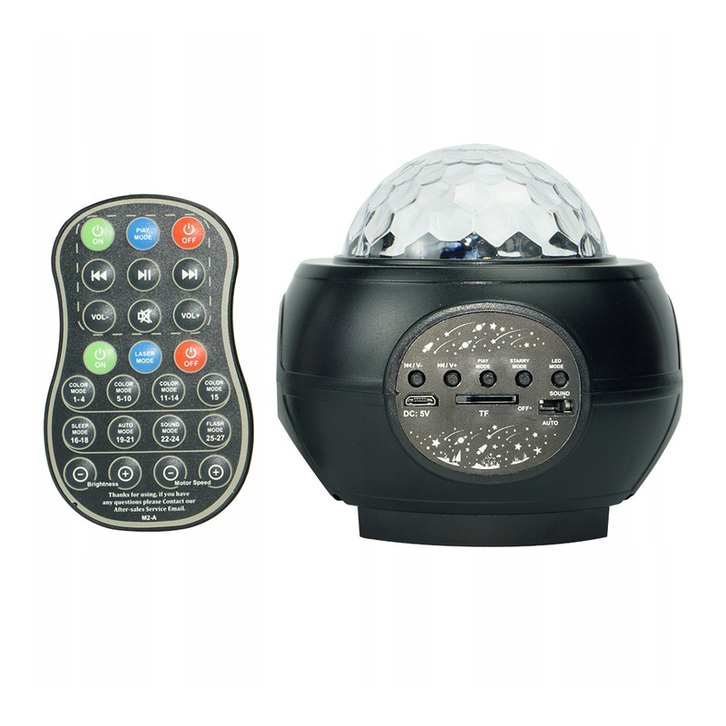 Urządzenie oferuje aż 32 tryby oświetlenia, w tym spektakularne czterokolorowe wodne wzory (czerwony, biały, niebieski, zielony) oraz laser czerwony i zielony, który tworzy realistyczny efekt rozgwieżdżonego nieba. Kolory, jasność i prędkość animacji można dowolnie regulować, dopasowując klimat do nastroju.