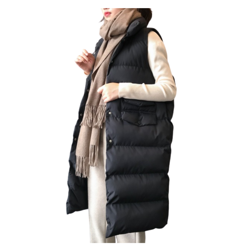Czarna długa kamizelka puchowa typu oversize to świetny wybór dla kobiet, które cenią wygodę i nowoczesny look. Sięgająca do kolan, doskonale sprawdzi się w chłodniejsze dni jesienią i zimą, stanowiąc idealne uzupełnienie codziennych stylizacji.