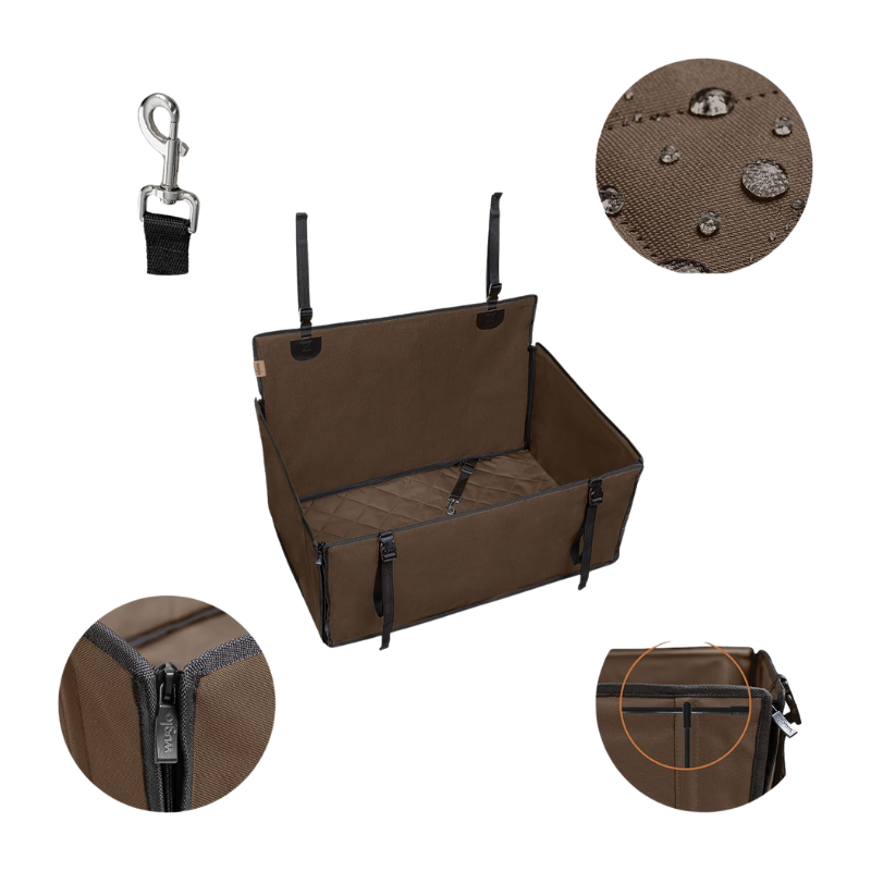 Przestronne i solidne siedzisko samochodowe dla psa przeznaczone jest do bezpiecznego przewozu średnich i większych zwierząt na tylnej kanapie samochodu. Wzmocniona konstrukcja z wewnętrznym usztywnieniem zapewnia stabilność oraz komfort jazdy nawet podczas skrętów i gwałtownego hamowania. Produkt skutecznie chroni tapicerkę przed sierścią, zabrudzeniami i wilgocią. Wodoodporny materiał oraz regulowane paski mocujące umożliwiają szybki i pewny montaż. Brązowa kolorystyka nadaje siedzisku uniwersalny i estetyczny wygląd, pasujący do wnętrza większości pojazdów.