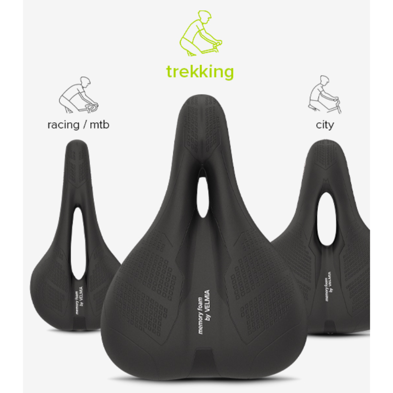 Ergonomiczne siodełko rowerowe Velmia zostało zaprojektowane z myślą o komforcie podczas codziennej jazdy rekreacyjnej, trekkingowej oraz miejskiej. Dzięki zastosowaniu pianki memory z efektem pamięci kształtu dopasowuje się do anatomii użytkownika, redukując nacisk i poprawiając stabilność w trakcie jazdy. Specjalna koncepcja 3 stref wspiera naturalną pozycję ciała, zwiększając wygodę nawet na dłuższych trasach. Model unisex sprawdzi się zarówno w rowerach górskich, jak i szosowych oraz elektrycznych.