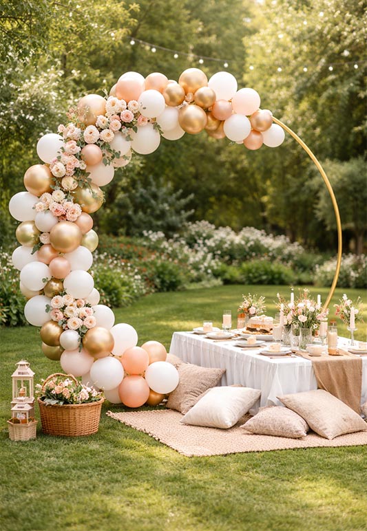Dzięki dużej średnicy 180 cm konstrukcja pozwala na tworzenie spektakularnych aranżacji z kwiatów, balonów, tkanin czy dekoracji świetlnych. Złote wykończenie nadaje dekoracji elegancji i podkreśla wyjątkowy charakter wydarzenia.