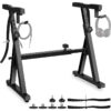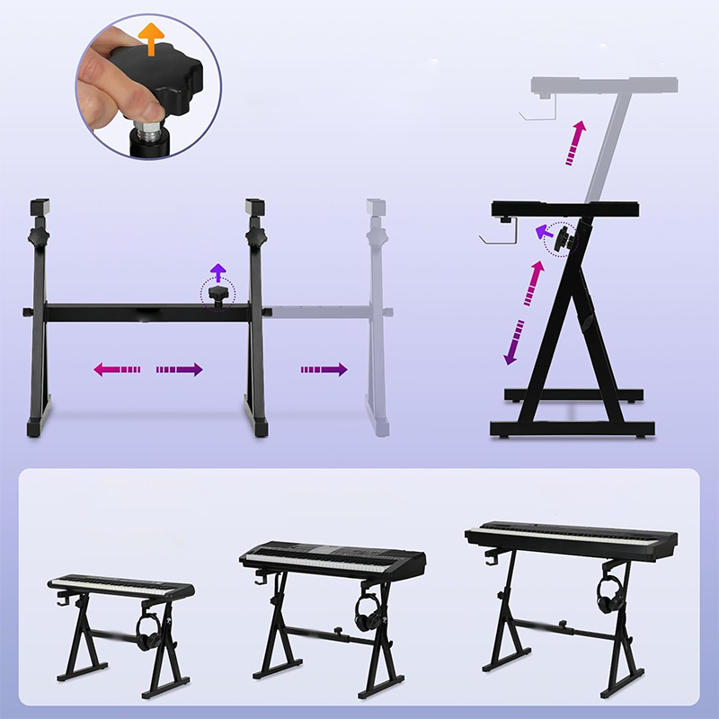 Jego regulowana wysokość (54–82,5 cm) i szerokość (55,5–89,5 cm) pozwalają idealnie dopasować ustawienie do własnych potrzeb – niezależnie od tego, czy grasz na siedząco, czy na stojąco. To rozwiązanie, które dba o Twój komfort i ergonomię podczas długich godzin ćwiczeń czy występów.