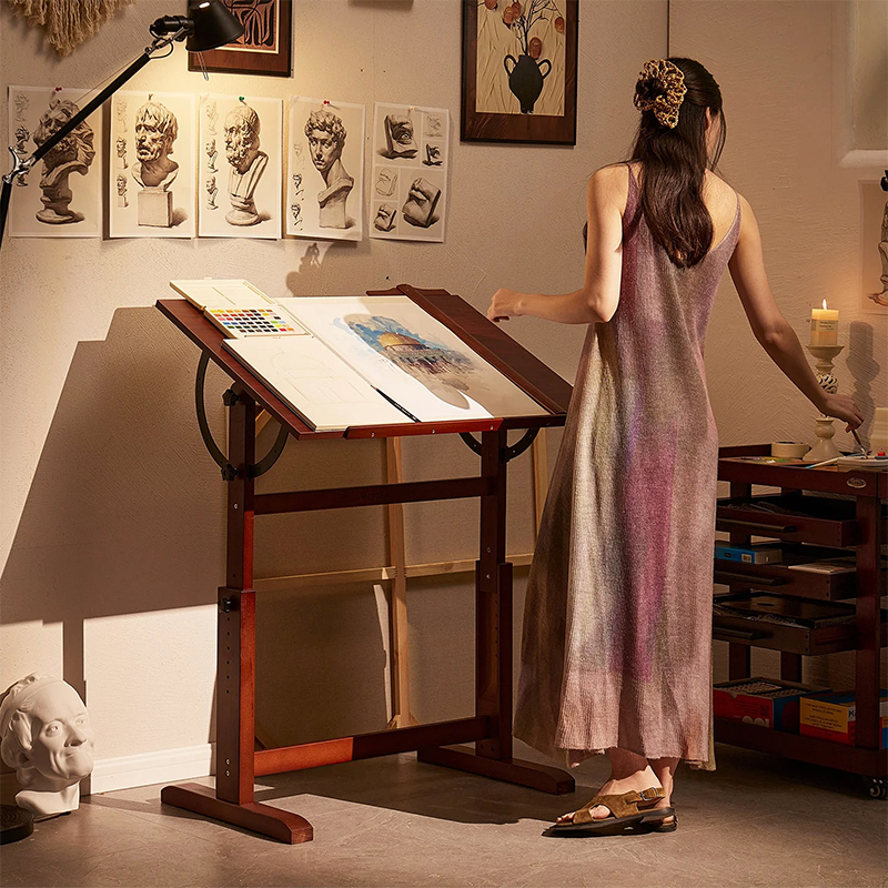 Profesjonalny stół kreślarski w kolorze ciemnego orzecha to idealne rozwiązanie dla artystów, projektantów, architektów, studentów oraz wszystkich osób pracujących twórczo. Regulowany blat oraz solidna konstrukcja zapewniają komfort pracy, ergonomię i estetyczny wygląd w jednym.