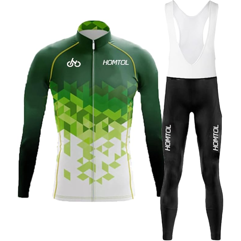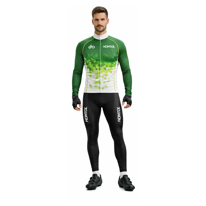 Męski strój rowerowy kolarski w kolorze zielonym to funkcjonalny komplet zaprojektowany z myślą o regularnych treningach oraz rekreacyjnej jeździe na rowerze. Zestaw składa się z koszulki z długim rękawem oraz długich spodni z szelkami i wkładką, co zapewnia stabilne dopasowanie i wysoki komfort użytkowania. Oddychający i szybkoschnący poliester skutecznie odprowadza wilgoć, pomagając utrzymać suchą skórę nawet podczas intensywnego wysiłku. Wiatroszczelna konstrukcja zwiększa komfort w chłodniejsze dni, a elementy odblaskowe poprawiają widoczność po zmroku. Wydłużony tył koszulki dobrze układa się w pozycji kolarskiej.