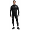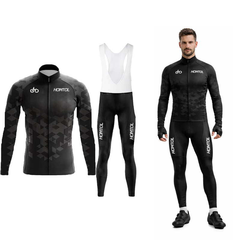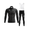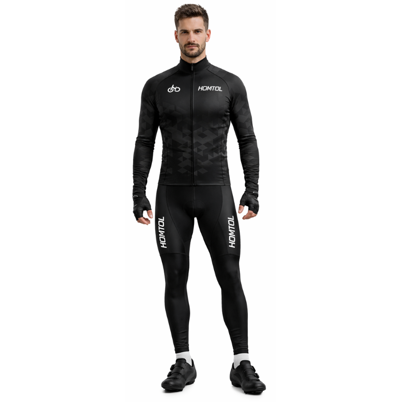 Męski strój rowerowy kolarski w klasycznym czarnym kolorze to funkcjonalny komplet przeznaczony do treningów oraz rekreacyjnej jazdy na rowerze. Zestaw składa się z koszulki z długim rękawem oraz długich spodni z szelkami i wkładką, co zapewnia stabilne dopasowanie podczas jazdy. Oddychający i szybkoschnący materiał skutecznie odprowadza wilgoć, zwiększając komfort nawet przy intensywnym wysiłku. Wiatroszczelna konstrukcja chroni przed chłodniejszym powietrzem, a elementy odblaskowe poprawiają bezpieczeństwo po zmroku. Wydłużony tył koszulki dobrze układa się w pozycji kolarskiej.