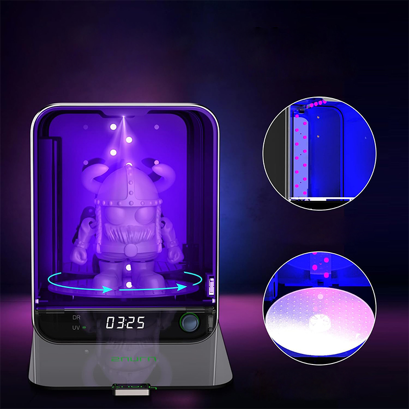 Profesjonalna suszarka do żywicy UV to niezastąpione urządzenie dla każdego użytkownika drukarek 3D SLA/DLP/LCD. Dzięki niej utwardzanie modeli staje się szybsze, wydajniejsze i dokładniejsze niż kiedykolwiek wcześniej. Zaawansowana technologia UV o mocy 42 W oraz aż 20 lamp LED (4 górne, 4 dolne i 12 bocznych) gwarantują równomierne i skuteczne utwardzanie każdego detalu – niezależnie od kształtu czy rozmiaru wydruku.
