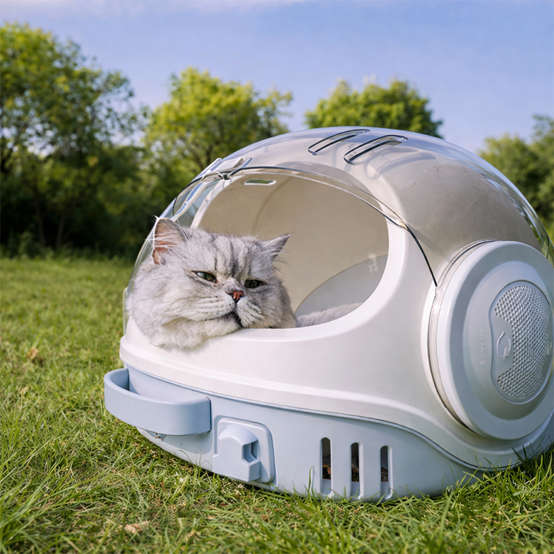 Nowoczesny transporter w formie kapsuły to bezpieczne i komfortowe rozwiązanie do przewozu kota podczas wizyt u weterynarza, podróży czy spacerów. Ergonomiczna konstrukcja zapewnia zwierzęciu wygodę, a właścicielowi – łatwość transportu.