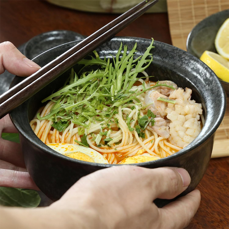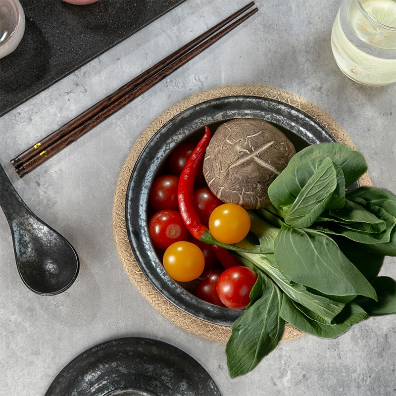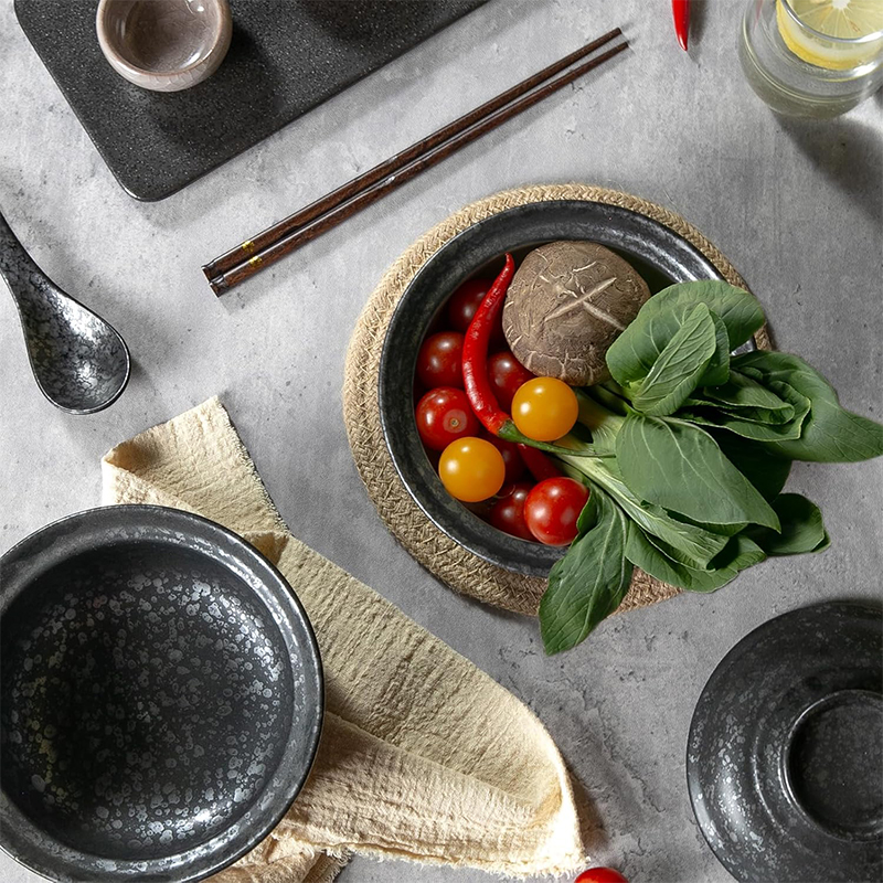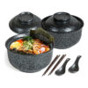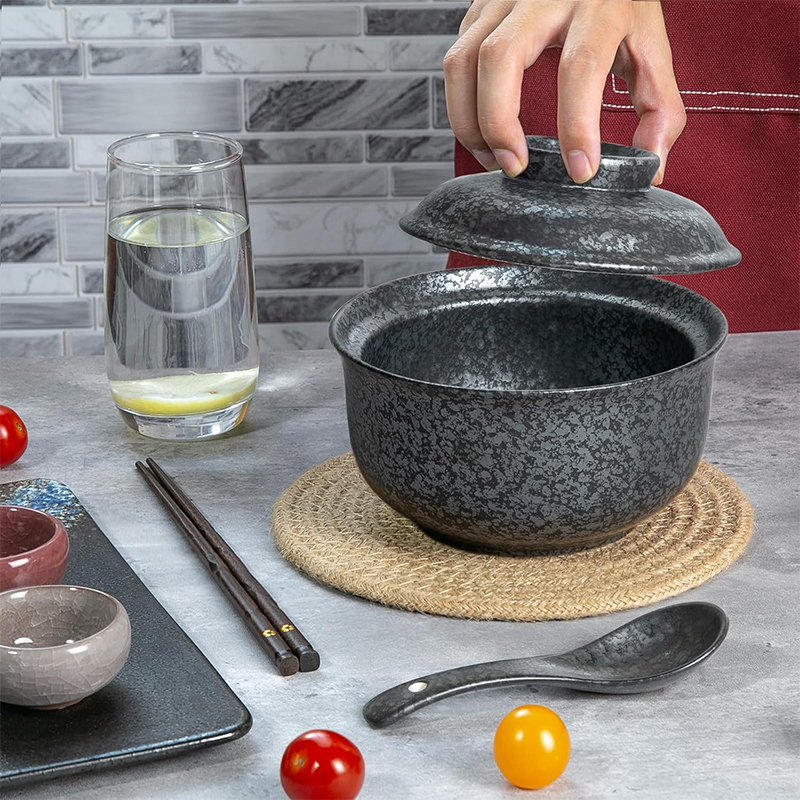 Każda miska została wykonana z wysokiej jakości ceramiki odpornej na wysoką temperaturę, zapewniającej trwałość, wygodę użytkowania i estetyczny wygląd przez długie lata. Unikalny, kamienny wzór w odcieniach czerni i szarości nadaje im charakteru inspirowanego japońskim minimalizmem i naturalnością. Dzięki pokrywkom Twoje dania dłużej utrzymują ciepło, a dołączone łyżki i pałeczki sprawiają, że jedzenie staje się nie tylko przyjemnością, ale i autentycznym doświadczeniem kulinarnym w japońskim stylu.