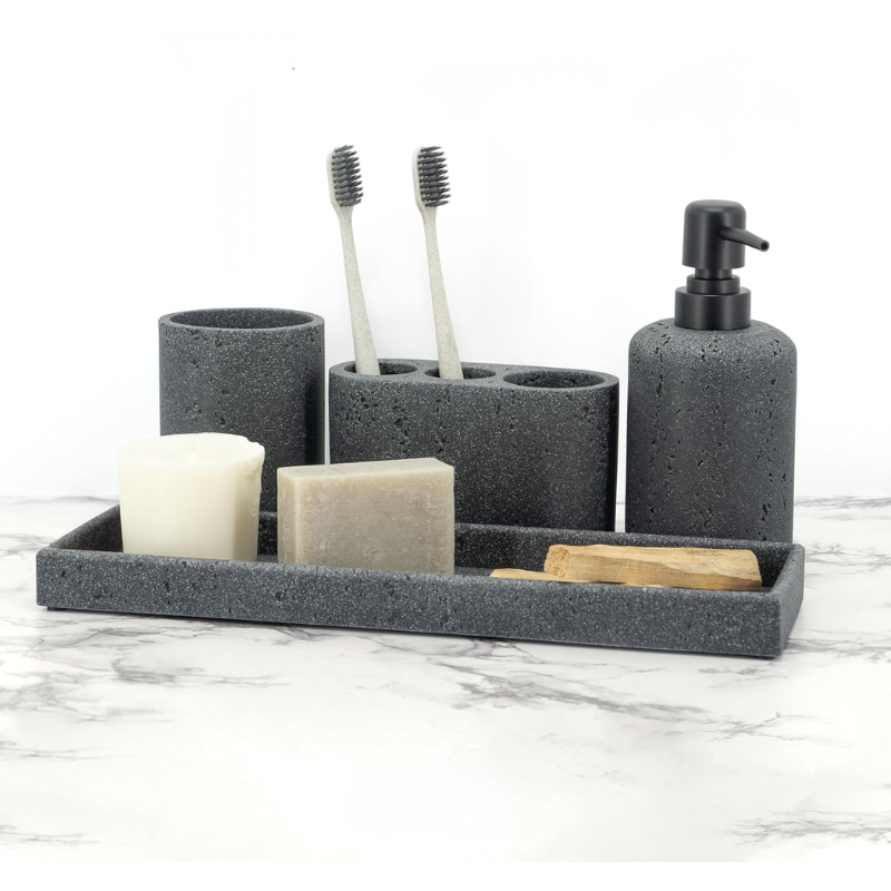 Nowoczesny zestaw akcesoriów łazienkowych ZCCZ w czarnym kolorze to eleganckie i praktyczne rozwiązanie do uporządkowania przestrzeni na blacie. Wykończenie imitujące czarny kamień nadaje wnętrzu wyrazisty, współczesny charakter i doskonale komponuje się z nowoczesnymi aranżacjami łazienek. Komplet łączy estetykę z funkcjonalnością, zapewniając wygodę codziennego użytkowania. Solidna konstrukcja z żywicy sprawia, że elementy są stabilne i odporne na uszkodzenia. Zestaw sprawdzi się zarówno w domowej łazience, jak i jako stylowy prezent.
