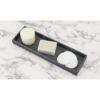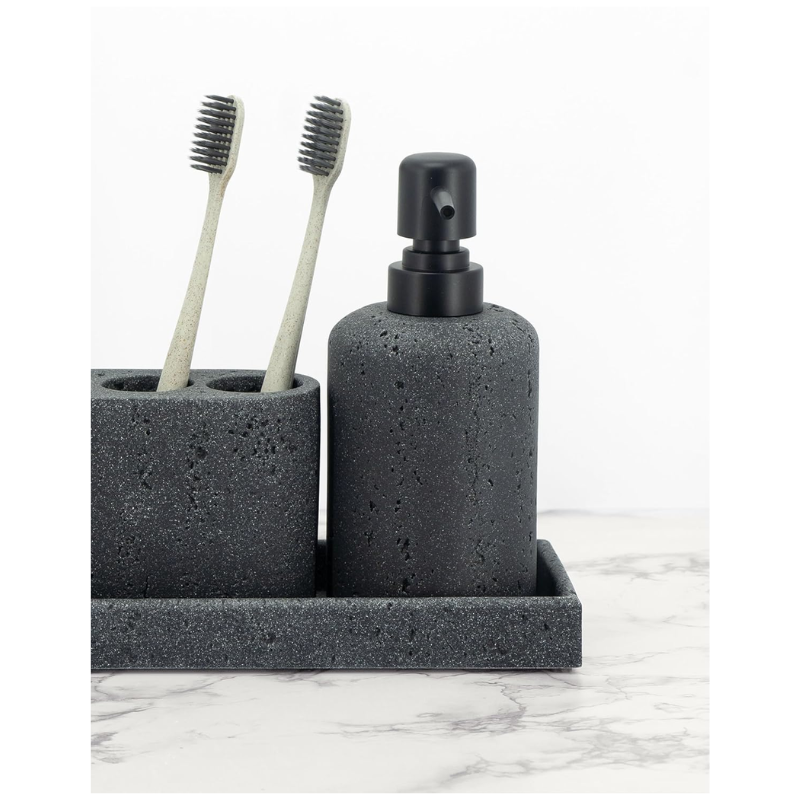 • Elementy zestawu: dozownik mydła z pompką, uchwyt na szczoteczki i pastę, kubek łazienkowy, taca toaletkowa