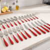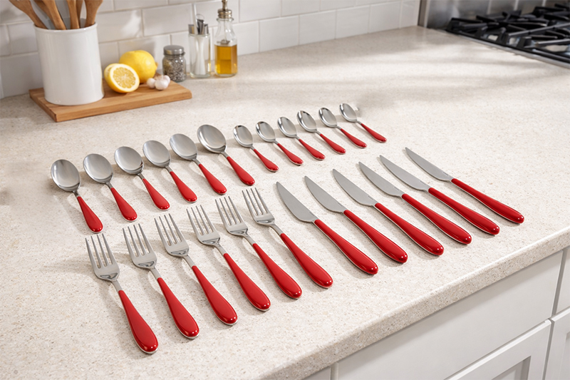 Sztućce wyposażone są w ergonomiczne uchwyty wykonane z trwałego tworzywa ABS. Zapewniają one wygodny chwyt oraz odporność na uszkodzenia podczas codziennego użytkowania.