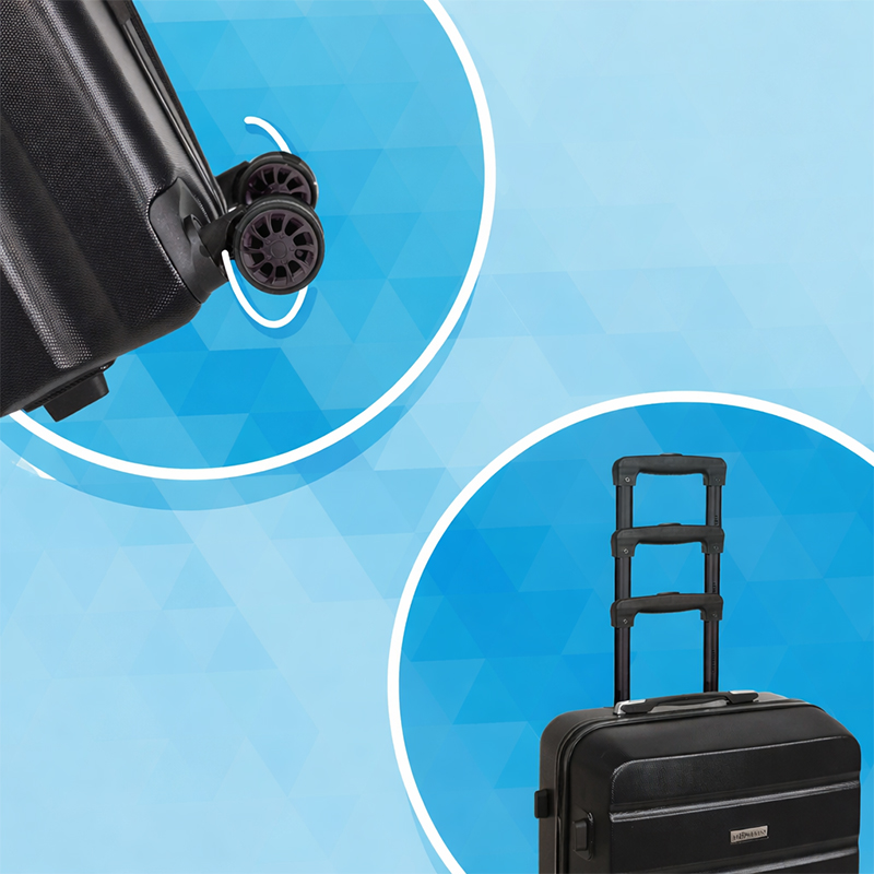 - Wygodne przemieszczanie: Walizki posiadają wysuwane teleskopowe rączki oraz obrotowe kółka, które zapewniają płynne prowadzenie i łatwe manewrowanie w różnych warunkach – na lotnisku, dworcu czy w hotelu.